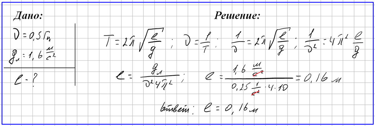 Задача № 5. Какова длина математического маятника, совершающего гармонические колебания с частотой 0,5 Гц на поверхности Луны? Ускорение свободного падения на поверхности Луны 1,6 м/с2.