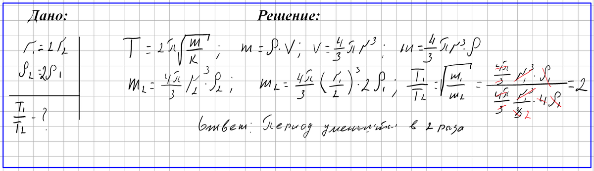 Пружинный маятник. Задача № 7. Как и во сколько раз изменится период колебаний пружинного маятника, если шарик на пружине заменить другим шариком, радиус которого вдвое меньше, а плотность в два раза больше? Для подробного изучения решения задачи посмотрите видео: