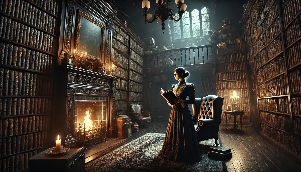 В комнате царила полутьма, и только угли в камине слегка тлели, отбрасывая колеблющиеся тени на стены. Странно, но Элеонора ощутила, что в библиотеке кто-то есть. Едва различимые шаги прошуршали за книжным стеллажом.