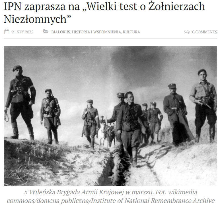 Польский институт национальной памяти анонсировал большую викторину на знание истории антисоветского подполья 1944-1956 гг. На их сайте размещено объявление для родителей учеников 6-8 классов с призывом подать письменную заявку (в Польше действует очень строгая процедура по персональным данных несовершеннолетних, настоящая бюрократическая викторина) для участия в конкурсе. Главный приз - 2000 злотых (про сумму написано в положении конкурса на официальном сайте). На секунду - это почти 50,000 российских рублей! Неплохая такая мотивация узнать больше о карателях из Армии Краёвой. Заставкой к конкурсу служит фотография 5 Виленской бригады которая известна печальной резней в Дубниках. Если кратко - литовские нацисты сперва устроили резню в польской деревне, в ответ на это 5-я Виленская бригада вырезала литовскую деревню. Литовскую? Если посмотреть список её жителей то там сплошь беларуские и русские имена и фамилии, и лишь несколько литовских. Кроме того, бригада отказалась принимать учас