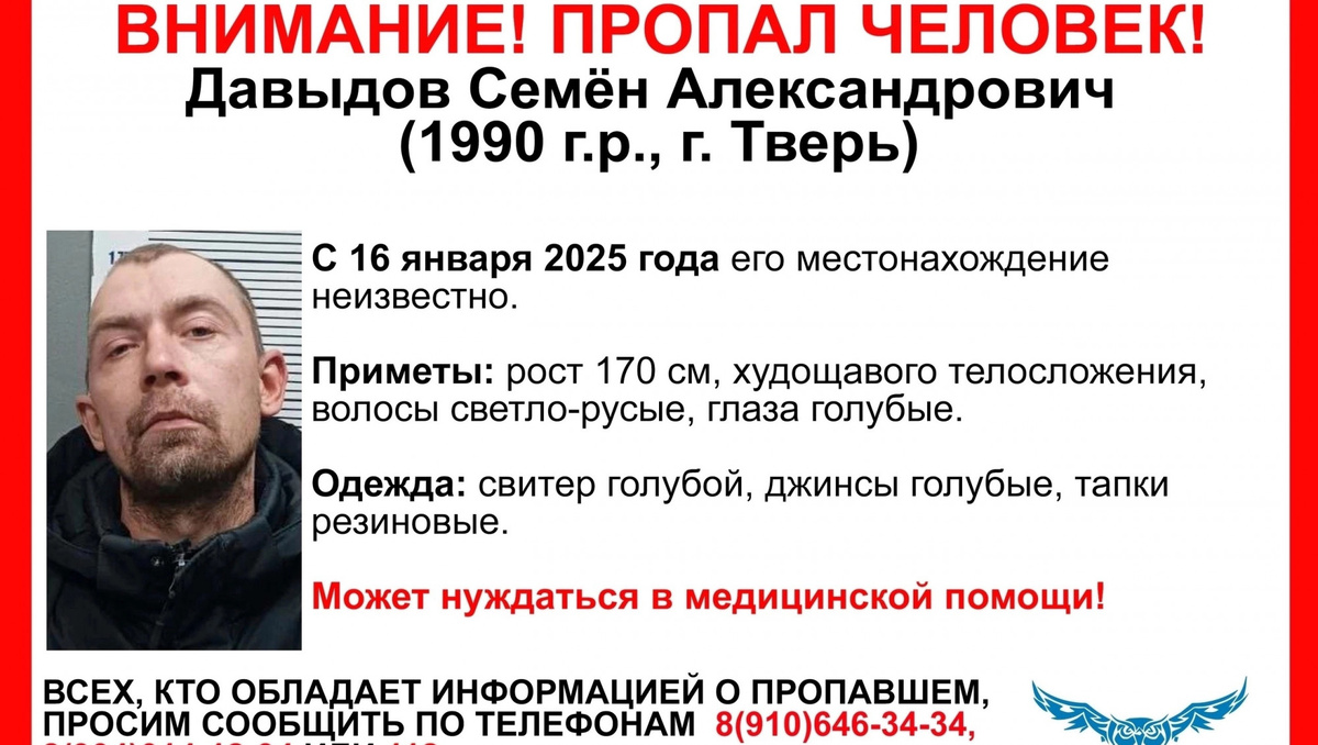 Еще 16 января в Твери ушел из дома в резиновых тапках, свитере и джинсах и пропал 34-летний Семен Александрович Давыдов. Ориентировка для поиска мужчины опубликована в группе тверского волонтерского поисково-спасательного отряда "Сова". Приметы: рост 170 см, худощавого телосложения, волосы светло-русые, глаза голубые. Одежда: свитер голубой, джинсы голубые, тапки резиновые. Волонтеры сообщают, что пропавший может нуждаться в медицинской помощи, и просят сообщать информацию о нем по телефонам отряда: 8 (910) 646-34-34 и 8 (904) 014-12-34