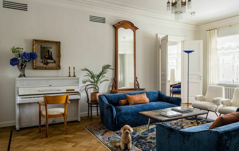 Светлый цвет стен и дверей был изначально в квартире, дизайнер разбавила его кобальтовыми оттенками. Эта комбинация вдохновила на название проекта: «Белая тарелочка — синяя каемочка, или Тихая квартира». Акцентным оттенком стал синий — он присутствует в светильниках, бархатной обивке диванов и ковре в гостиной, в натюрморте Петра Петяева в столовой, в прикроватных столиках в хозяйской спальне и даже в столовой посуде.