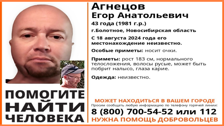 В Болотном Новосибирской области без вести пропал 43-летний Егор Агнецов. Как сообщили в поисково-спасательном отряде «ЛизаАлерт», с 18 августа 2024 года его местонахождение неизвестно. Мужчину давно ищет полиция и его родные, теперь к поискам подключились волонтёры. Приметы пропавшего: рост 183 сантиметра, нормального телосложения, волосы русые, может быть побрит налысо, глаза карие. В какой одежде был пропавший сибиряк неизвестно. Если у вас есть информация о местонахождении Егора Агнецова, сообщите об этом по телефону 8-800-700-54-52 или наберите 112. Ранее «Вести Новосибирск» писали, что в регионе без вести пропал 32-летний мужчина со шрамом над губой.