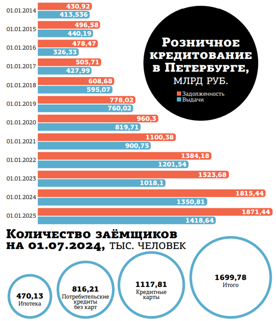 Регулятор традиционно не отображает структуру выдач по видам ссуд. Но можно ориентироваться на данные бюро кредитных историй. Так, по информации НБКИ, в 2024–м в Петербурге на покупку автотранспорта было выдано 115 млрд рублей. Таким образом, в 2024 году жители города на свои потребительские нужды (по кредитным картам или кредитам наличными) взяли в банках свыше 1,04 трлн рублей. Это на 20%, или на 175 млрд, больше результатов 2023–го.