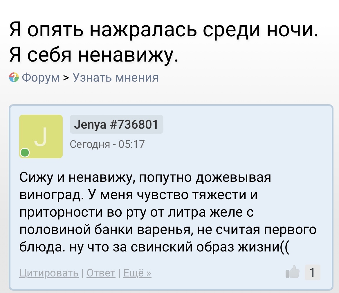 Вот такое сообщение увидела я на одном из психологических форумов: Среди моих клиентов есть люди с ночными перееданиями. И это реально неприятная проблема. ▪️Во-первых, эмоциональный дискомфорт. Чувствуется сколько боли в словах «я себя ненавижу». Обычно ночные переедания сопровождаются сильным чувством вины и стыда утром и попытки начать день с чистого листа, исправить ошибку. ▪️Во-вторых, физический дискомфорт: Ночные пробуждения сокращают сон + потом трудно уснуть с чувством тяжести. Это приводит к недосыпам. ⠀Когда я спросила в запрещённой соцсети про самую распространённую причину ночных перееданий, некоторые предположили тревожность и другие эмоциональные причины. Это всё имеет место быть, но самая распространённая причина другая. И это… ⠀ ДНЕВНЫЕ НЕДОЕДАНИЯ. Среди многих вопросов на форуме нашёлся таки человек, который спросил как девушка питается днём. Ии… Гипотеза подтвердилась. Это может выглядеть так: ▪️Ночное переедание вызывает чувство вины и недосып. ▪️Утром отсутствуе