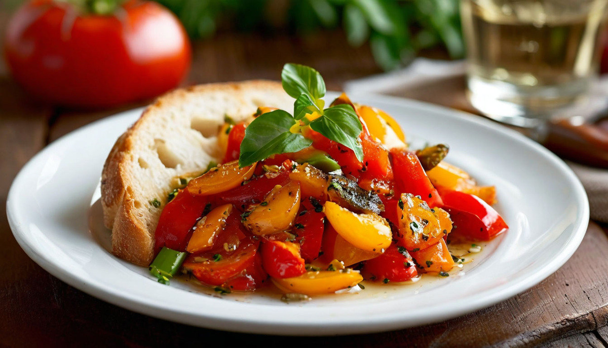 50 мин Перец болгарский (красный) – 300 г Перец болгарский (зеленый) - 300 г Перец болгарский (желтый) – 300 г Помидоры – 500 г Красный лук – 1 шт. Чеснок – 3 зубчика Оливковое масло – 5-6 ст.л. Орегано/базилик сушеный – 1 ч.л. Соль – по вкусу Молотый черный перец – по вкусу Сахар – 2-3 щепотки (по вкусу) Томатная паста - 1 ст.л. (при необходимости) 1. На среднем огне разогрейте оливковое масло. Добавьте нарезанный тонкими полукольцами красный лук и нарезанные половинками зубчики чеснока. 2. Затем уменьшите огонь до минимального и, периодически помешивая, обжаривайте лук и чеснок 10-15 минут, до мягкости. Приготовление на маленьком огне позволяет ароматизировать масло и сохранить цвет красного лука. 3. Когда лук станет мягким, извлеките из сковороды зубчики чеснока и добавьте нарезанный полосками разноцветный сладкий перец. Прикройте сковороду крышкой и, периодически помешивая, готовьте перец на среднем огне 15 минут. 4. Надрежьте кожуру помидоров крест-накрест, залейте кипятком и о