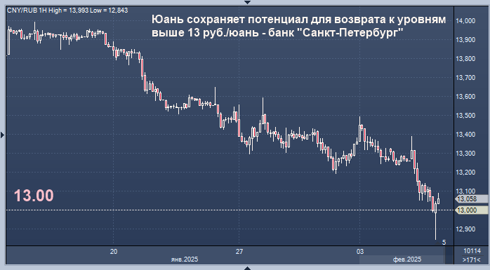 Юань сохраняет потенциал для возврата к уровням выше 13 руб./юань - банк "Санкт-Петербург" Курс доллара к рублю расчётный, фьючерс, вечный фьючерс и межбанк. Курс евро к рублю расчётный, фьючерс, вечный фьючерс и межбанк. Курс юаня к рублю биржевой, фьючерс, вечный фьючерс и межбанк. Юань сохраняет потенциал для возврата к уровням выше 13 руб./юань, говорится в обзоре банка "Санкт-Петербург". "Рубль в среду заметно укреплялся, поддержку курсу оказывает приток валюты от со стороны экспортеров и Банка России после завершения длинных праздников в Китае, - отмечают аналитики. - В моменте на стороне рубля мог играть и анонс февральских операций Минфина по бюджетному правилу, в рамках которого чистые продажи юаней со стороны ЦБ с пятницы увеличатся с 4,8 до 5,6 млрд руб./сутки. В четверг курс CNY/RUB находится у 12,94 руб./юань. Другие валюты EM с утра преимущественно слабеют. ЦБ уже должен был завершить ускоренную продажу валюты для компенсации "паузы" во время китайских праздников. На этом