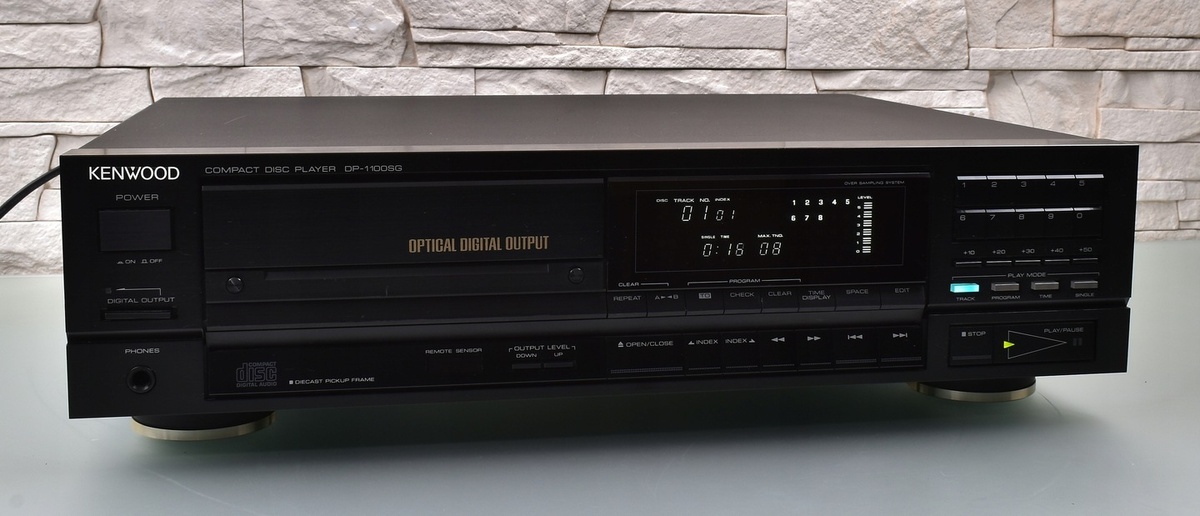 Ну а теперь вернёмся к настоящему. Практически в каждом своём посте я упоминаю, что к сообществу магнитофонолюбов я приобщился совсем недавно, и что всё у меня началось с покупки кассетной деки KENWOOD KX1100-HX. Собственно, всё потом и закрутилось вокруг неё. В идеале хотелось бы собрать монобредовую стойку той же самой серии, но я сильно ограничен в пространстве и такая стойка мне, увы, не светит. Но стойка хоть и не светит, а я всё равно посматриваю в сторону различных её компонентов. В итоге, несмотря на ограничения в условиях, я всё-таки купил себе эквалайзер KENWOOD GE-1100. Другим компонентом, который хотелось бы приобрести, является CD-проигрыватель KENWOOD DP-1100SG. А выглядит он вот так: