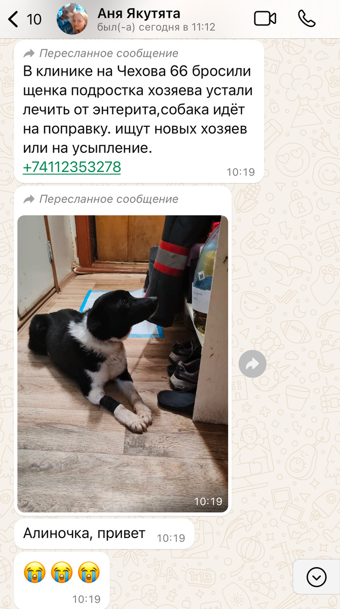 А потом «утилизация»… Это никогда не кончится!!! Ане прилетела информация… Хозяйская собака заболела энтеритом, её лечили, лечили… Когда собака пошла на поправку - сдались… пришли в клинику и заявили, что денег больше нет на лечение (восстановление), сил нет, усыпляйте!!! 😰 Написали вот такой короткий текст и стали рассылать по всем чатам нам в частности… с кличем! Или в срочном порядке кто-то отзовется и спасет жизнь подростку, или ее просто усыпят, не доведя дело до конца! Я даже не знаю как комментировать это всё! Какой-то маразм… Лечили, лечили и вот так… Не люблю осуждать и не хочу… Бог нам всем Судья… Каждый получит по делам, не нам судить, сами не святые… А вот собачулю жалко…🥺 Обращаемся к Вам за помощью, советом! Кто следит за нами, тот знает, что на попечении уже больше пол сотни спасенышей! Мы не приют, у нас нет своего места, мы просто вытаскиваем и распределяем на платные передержки до пристроя, плюс корма, вывозы из Якутска и прочие расходы, плюс есть больные собачк
