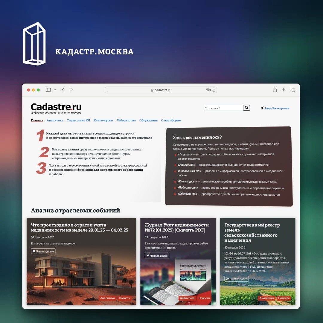 Справочник Cadastre.ru, который преобразуется в платформу непрерывного профессионального образования, получил новый облик В 2005 году мы начали в единой системе собирать и упорядочивать положения нормативно-правовых актов, сначала для межевания. Со временем это превратилось в популярное электронное и печатное пособие «Кадастр недвижимости». В 2011 году были разработаны первые в отрасли сервисы и материалы для подготовки к экзамену на кадастрового инженера, а также социальная сеть «Ассоциация кадастровых инженеров». В 2018 году Cadastre.ru был перезапущен в форме обновленного Справочника кадастрового инженера и ленты вопросов и ответов. Вышел первый номер ежемесячного PDF-журнала. В 2024 году началось преобразование постепенно выросшего портала в комплексную цифровую образовательную платформу. Со временем на портале стало много разделов, и найти нужный материал или сервис уже не так просто. Поэтому сейчас появилась навигация: За 20 лет нами постепенно была выработана методика структурир