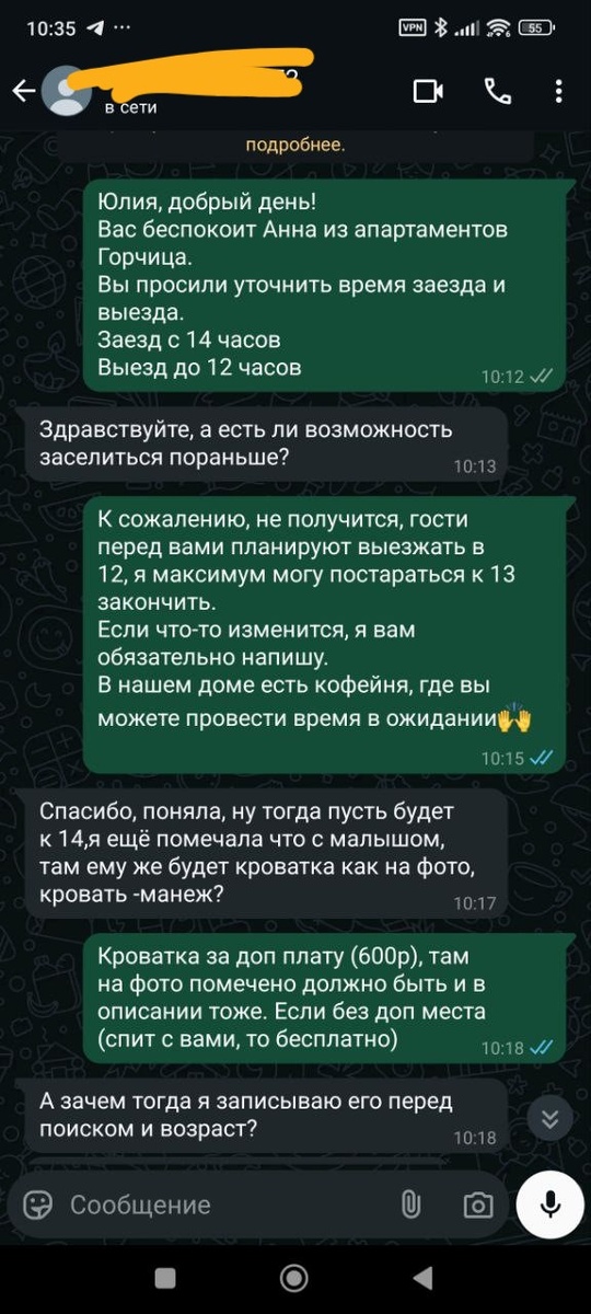 Я могла бы пойти навстречу и повозиться с кроваткой, если бы бронь была на несколько суток. Но в данной ситуации мне совсем не хотелось идти навстречу, кроватка добавляет к уборке перед и после минимум по 20 минут + доставка кроватки. У нас в галерее на фото с кроваткой четко прописано, что кроватка "ПО ЗАПРОСУ" и её стоимость. При этом гость написал всего за 1 день до заезда, а вдруг она у нас была бы в этот день занята?