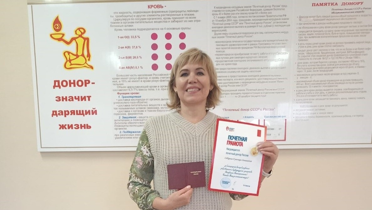 В Башкирии более 11,2 тысячи жителей, удостоенных звания «Почетный донор России», получат более 18 тысяч рублей. Об этом сообщила министр семьи, труда и социальной защиты населения РБ Ленара Иванова. По ее словам, на ежегодную выплату могут рассчитывать жители, удостоенные звания «Почетный донор России» и «Почетный донор СССР». Средства поступят на счета получателей до 1 апреля 2025 года. Ленара Иванова рассказала, что одна из почетных доноров России Гульнара Сабурова — сотрудница филиала Республиканского центра социальной поддержки населения по городу Нефтекамску. Женщина регулярно сдает плазму крови уже больше 10 лет, тем самым спасая жизни других людей. Такое продолжение получила её профессиональная деятельность, тоже связанная с помощью людям — оформлением выплат и льгот, поддержкой в трудной жизненной ситуации. Более того, неравнодушная сотрудница вдохновила и других коллег на донацию, показывая на своем примере, что донорство — это не только почетно, но и полезно для организма. П