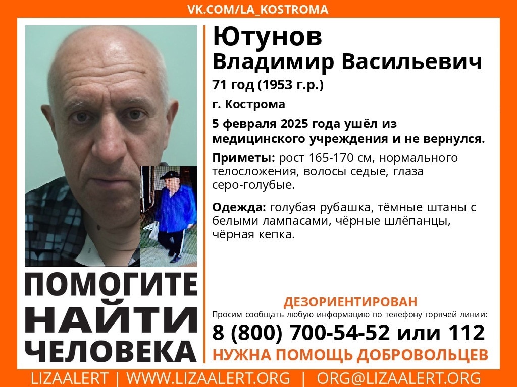 Ютунов Владимир Васильевич пропал 5 февраля В Костромской области ищут 71-летнего Ютунова Владимира Васильевича, который сбежал из медицинского учреждения 5 февраля. О старте его поисков объявили добровольцы поисково-спасательного отряда «ЛизаАлерт». Пенсионер может находиться за территорией Костромы. Кроме того, он дезориентирован. Особые приметы Владимира Васильевича: рост 160-170 сантиметров, нормальное телосложение, седые волосы и серо-голубые глаза. Был одет в голубую рубашку, тёмные штаны с белыми лампасами, чёрные шлёпанцы и белую кепку. Любую информацию о местонахождении пенсионера можно сообщить по номеру горячей линии 8(800) 70 52-52 или 112.