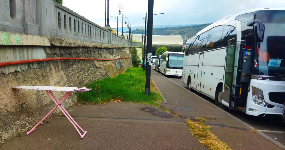 Она стояла одиноко, но жизнеутверждающе. Явно скучала. Приятный бледно-розовый цвет прекрасно смотрелся на фоне серой стены. Стройные ноги легко, но уверенно попирали землю… А рядом гремела автомобилями и огромными туристическими автобусами дорога. Рядом Кура несла свои тяжёлые воды вдаль. И весь этот грохот и суета большого города разбивались об её невозмутимость. И уют. Домашний уют в центре Тбилиси. Она и была символом уюта. Гладильная доска. Конечно, эта красавица произвела на меня большое впечатление. Вереницей выстроились многочисленные туристические автобусы. Они были пусты. Гости Тбилиси гуляли по улочкам и паркам столицы Грузии. Водители отдыхали, гостеприимно распахнув автобусные двери. А может и белье гладили. Устав отдыхать. И пока есть время. А почему бы и нет? Тбилиси не устает восхищать меня своими внезапными неожиданностями. Вот подземный пешеходный переход на площади Бараташвили, о котором я уже писала. Удивительное место в Тбилиси. Мало того, что его стены стараниями