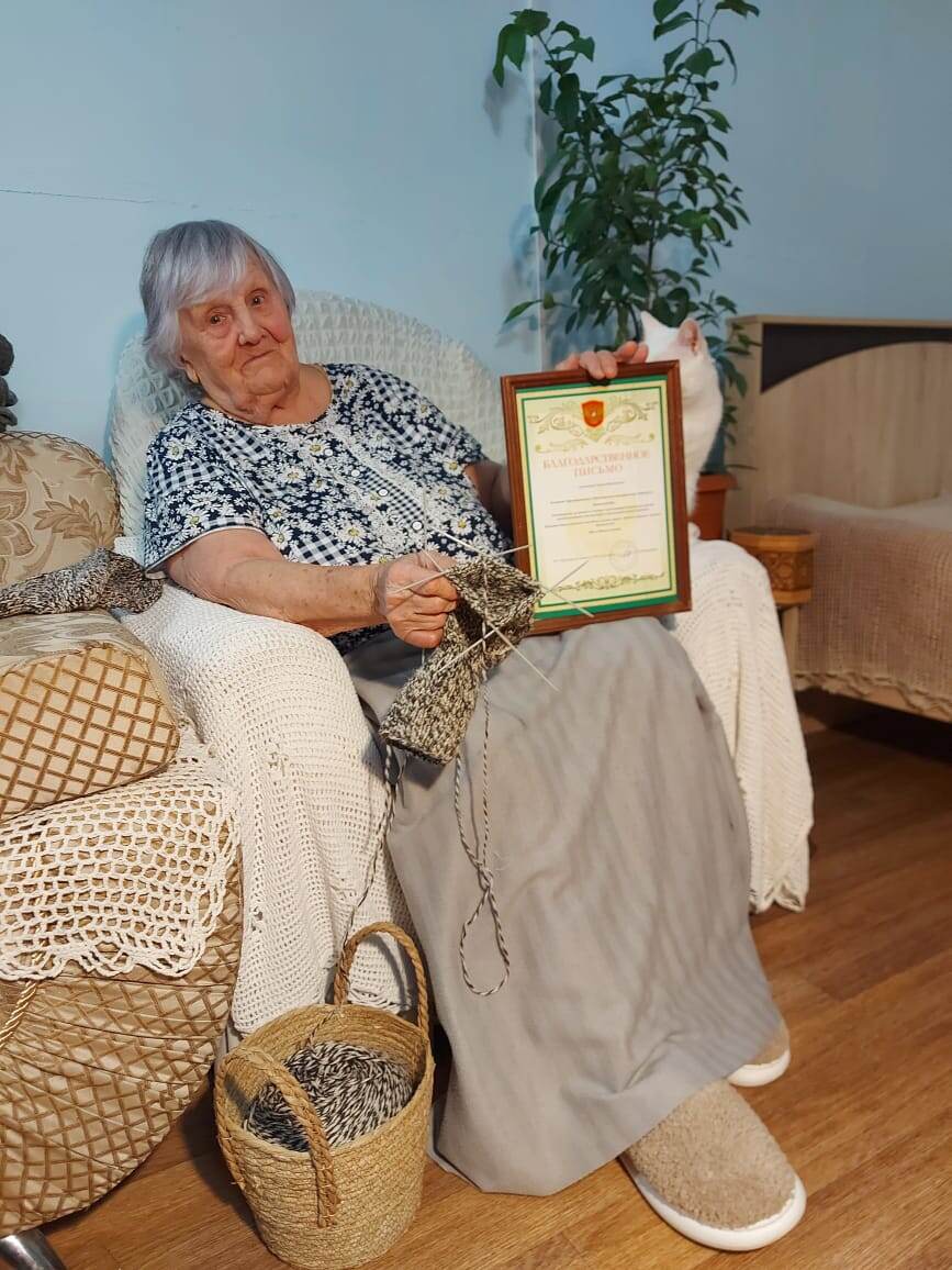 Таисия Михайловна Жидик живет в Кировском округе, два последних года она занимается практически "фабричным" производством вязаных носков. Более 150 наших военнослужащих благодаря Таисии Михайловне ощущают тепло родного дома. Когда началась Великая Отечественная война, омичке ещё даже не было 10 лет, но уже тогда поняла: общую беду можно преодолеть только сплотившись. Фото: Мэр Омска Сергей Шелест.