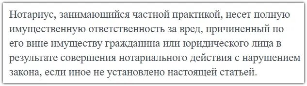 По закону частный нотариус несёт предпринимательский риск ненадлежащего исполнения нотариальных действий и полную имущественную ответственность за причинённые убытки (ч. 1 ст. 17 «Основ законодательства РФ о нотариате»).