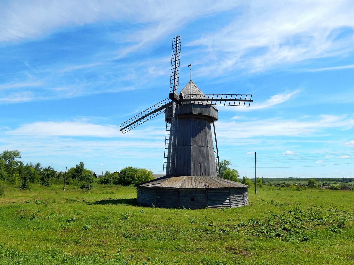 (Рязанская область, Шацкий район, с.Польное Конобеево) Мельница в Конобеево является единственной в Рязанской области и одной из восьми сохранившихся шатровок юго-востока России каркасных мельниц, амбар которых полностью окружает основную конструкцию, как "юбка". Построена она была в 1903 году. В начале ХХ века в крестьянской России насчитывали около 250 тысяч мельниц, в одном только Шацком уезде тогда ещё Тамбовской губернии в 1884 году их было 108, а в Польно-Конобеевской волости — семь. Мельница исправно перемалывала рожь в муку, но когда к гигантским жерновам подвели электричество, то крылья остановились: отправленные на пенсию они перестали вращаться. Их приветливый скрип сменила тишина. Старожилы припоминают, как к мельнице тянулся караван конных подвод с мешками зерна, помнят вечно осыпанного мукой мельника Константина Бердянова. Шатровка с четырьмя крыльями и двумя парами жерновов. Каркас обшит тёсом. Механизм мельницы довольно неплохо сохранился, отметим следующие вещи: