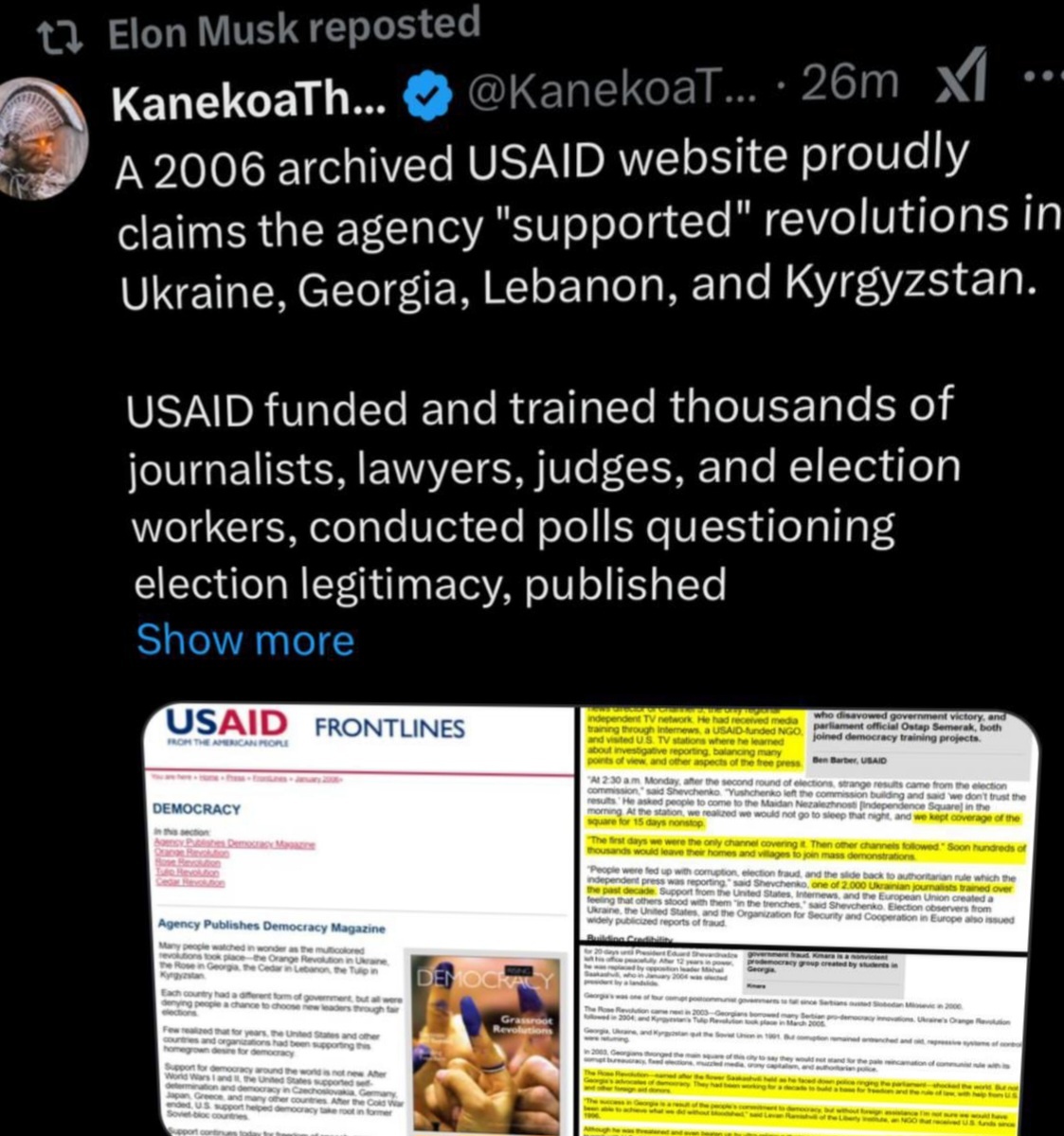 Архив сайта USAID за 2006 год с гордостью утверждает, что агентство «поддержало» революции в Украине, Грузии, Ливане и Киргизии.