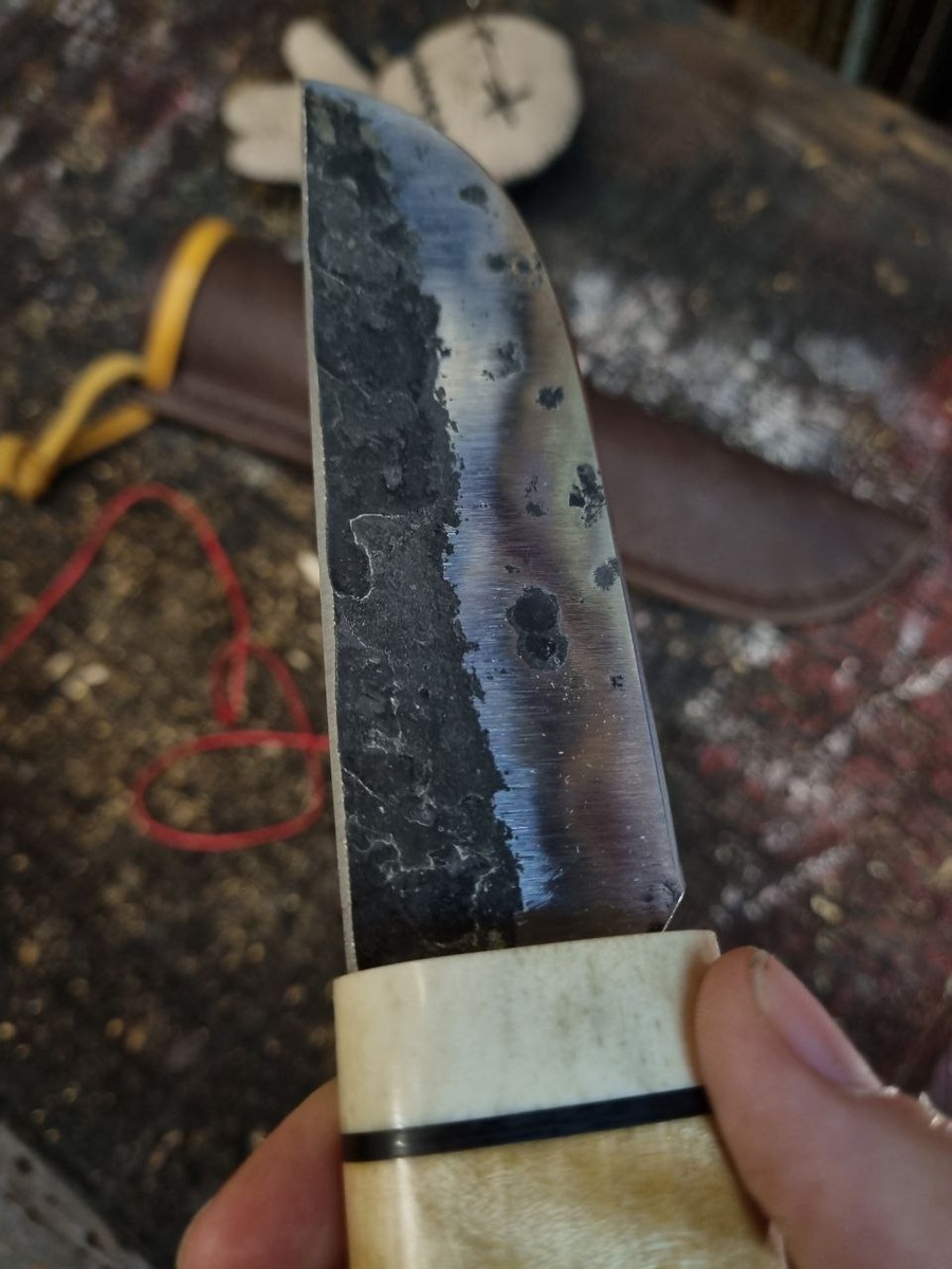 До того заработался, что опять забыл про соцсети. Ещё один ножичек уходит в добрые руки. Нож вышел простой с суровым северным характером. На клинке 65Г, с толстым обухом под 5мм, длиною в 11см, а шириной ближе к 3см. Должен признать, я собирался его сделать меньше, но получилось, как часто бывает, по-другому. Жизнь умнее архитектора. По рукояти был отдельный запрос, чтобы прямая, как на одном из моих старых ножей. Однако, заказчик дал свободу творчества, отчего я несказанно обрадовался и побежал, собственно, творить. Хотелось изначально сделать чего-то эдакое. Да чтоб такое эдакое, что ух прям. Хотел сначала из нескольких видов дерева, потом решил медный больстер, потом решил латунный, потом решил чёрный граб и так далее. Решился всё таки сделать больстер из рога, а остальную часть рукояти решил сделать из заготовленной берёзы, да покрыть заодно синим биогрунтом, в качестве эксперимента. Однако закончив шлифовку рукояти, поразился её красоте. Витиеватость структуры и перламутр