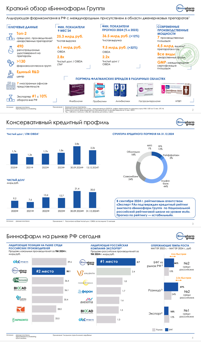 😃 Доброе утро, друзья! Ассортимент сегодня разнообразен :) ✅ Три выпуска начнут торговаться после обеда, ближе к 16:30 〰️〰️〰️〰️〰️〰️〰️〰️〰️〰️ 🟡 БИННОФАРМ ГРУПП 001Р-04 📊 🅰️ 🔹 ISIN: $RU000A10AS28 ▪️Купон фиксированный: 25.5% ▪️PUT-оферта через 1,5 года ▪️ Погашение через 3 года ▪️ Рейтинговый отчет: ➖ https://raexpert.ru/releases/2024/sep06d —————— 🏦 Финансовые показатели эмитента (за 9 месяцев 2024 года): 💬 В скобках указаны суммы за аналогичный период прошлого года. ⬆️ Выручка: 36,4 млрд. (31,0 млрд.) ⬇️ Чистая прибыль: -1,43 млрд. (+3,9 млрд.) 🛑 Краткосрочные заемные средства: 13,03 млрд. (1,97 млрд.) 🟢 Долгосрочные заемные средства: 6,22 млрд. (9,77 млрд.) Распрекрасные цифры отчетности, однако. Растет только выручка, на том спасибо. А вот чистая прибыль вообще ушла в минус, а краткосрочный долг в дверь даже не стучится, а барабанит. И при столь негативной картине и отсутствии годовой отчетности эмитент позволяет себе снизить купон на процент с ориентира и увеличить об