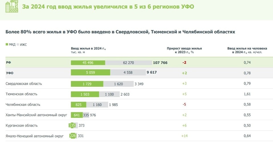 Дом.рф проанализировал рынок новостроек в Уральском федеральном округе (УФО). Согласно исследованиям финансового института, рост ввода жилья во всех регионах УФО в этом году продолжился. В Свердловской области он составил 3%, но по регионам эта цифра различается. По итогам 2024 г. портфель строящегося жилья в УФО вырос на 20% до рекордных 11,8 млн кв. м. В целом по России показатель увеличился на 8% до 114,4 млн кв. м. Четвертый год подряд объемы строительства многоквартирного жилья в Уральском федеральном округе растут. Девелоперы нарастили объемы стройки во всех регионах Урала. При этом наибольший прирост продемонстрировали Курганская область — на 39% до 426 тыс. кв. м и Ямало-Ненецкий АО — на 38% до 270 тыс. кв. м. А подавляющая доля портфеля строительства жилья — 88% — приходится на Свердловскую, Тюменскую и Челябинскую области, — отметила на онлайн-конференции «Развитие жилищного строительства в УФО» директор подразделения «Исследования в жилищной сфере» Аналитического центра ДОМ.