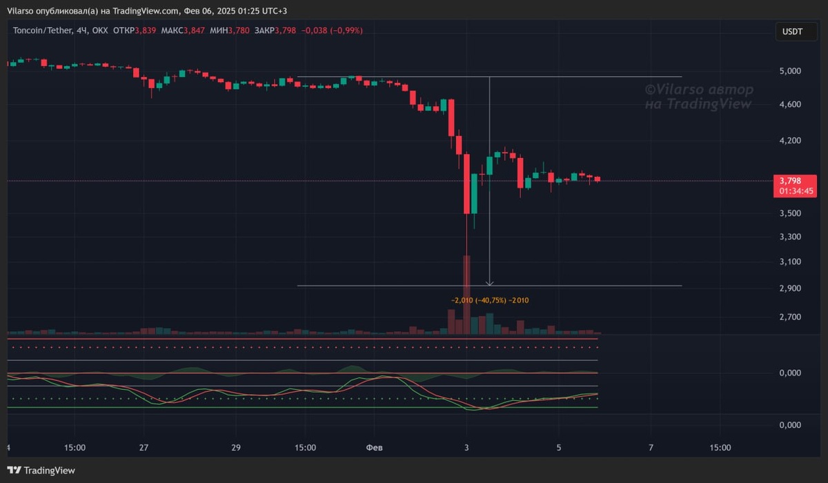 TON снизился на -40% на момент падения 3 февраля. Мемкоин VILARSO наоборот, вырос в цене на +24%.