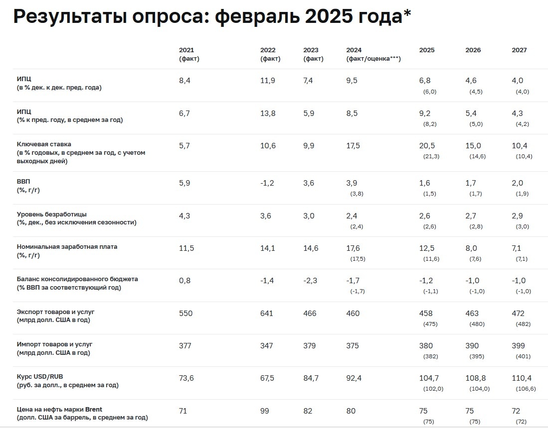Перед заседанием по ключевой ставке Банк России провел свой традиционный опрос ведущих аналитиков и получил консенсус-прогноз по ключевым макроэкономическим показателям на 2025-2027 годы. Ничего неожиданного не произошло: прогнозы по инфляции и курсу доллара в очередной раз ухудшились (так происходит уже года 1,5 с каждым новым прогнозом). Итак, посмотрим сначала на сводную таблицу прогноза: в скобках указаны предыдущие данные, полученные ЦБ в декабре, можно увидеть, как аналитики изменили мнение за последние 2 месяца. Теперь акцентирую внимание на самом важном. Прогноз по инфляции ухудшен очень значительно. Теперь среднегодовой показатель в 2025 году ждут на уровне 9,2% (в декабре ждали 8,2%, прибавился целый процентный пункт). А на конец года ждут 6,8% (было 6%). Также на 0,4 п.п. вырос прогноз по инфляции на 2026 год. Полагаю, этот прогноз еще не раз изменится в сторону повышения, лично я пока не вижу никаких предпосылок для снижения инфляции, ожидаю только дальнейшего роста (возмож
