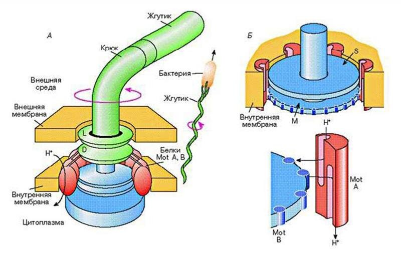 В отличие от обычных электродвигателей в макромире, работающих на основе электромагнитного взаимодействия, мотор жгутиков бактерий функционирует за счет положительно заряженного потока ионов водорода (протонов H), поступающих из внешней среды в клетку. Движение протонов осуществляется благодаря электрическому или pH-градиенту, который образуется в процессе окисления питательных веществ. Этот протонный поток провоцирует изменение формы одной из белковых молекул статора, что, в свою очередь, воздействует на белковую молекулу ротора, обеспечивая ее вращение. Здесь взаимодействие частей нанодвигателя происходит за счет электрических сил зарядов.