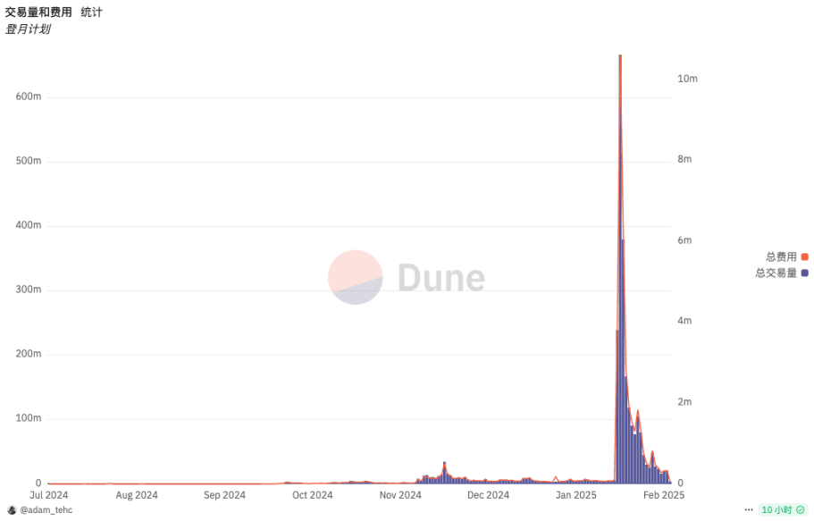 Данные Dune показывают, что в 2024 году объем торгов и комиссии на Moonshot в целом демонстрируют плавное развитие, ежедневный объем торгов находится около десятков миллионов долларов, а количество независимых трейдеров ежедневно составляет в среднем от 3500 до 4900. Это изменение состояния связано с тем, что президент США Дональд Трамп 18 января 2025 года выпустил свой личный Meme-токен TRUMP, после чего Moonshot запустила TRUMP, и официальный Twitter Трампа снова опубликовал сообщение для продвижения токена TRUMP, что вызвало всплеск интереса.