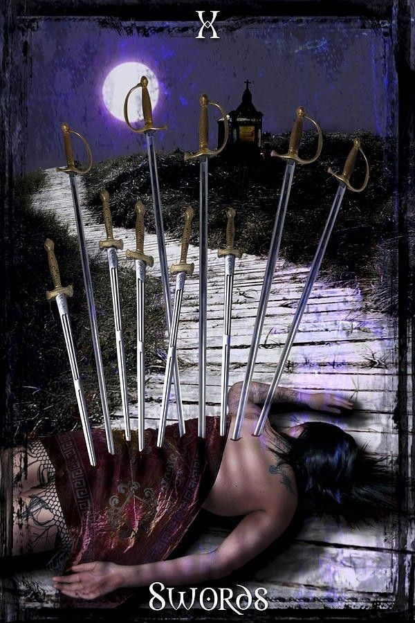 Карта "10 Мечей" изображает человека, лежащего лицом вниз с десятью мечами, воткнутыми в спину. Появление этой пугающей карты обычно сигнализирует о наступлении нежелательных событий в ближайшем будущем.