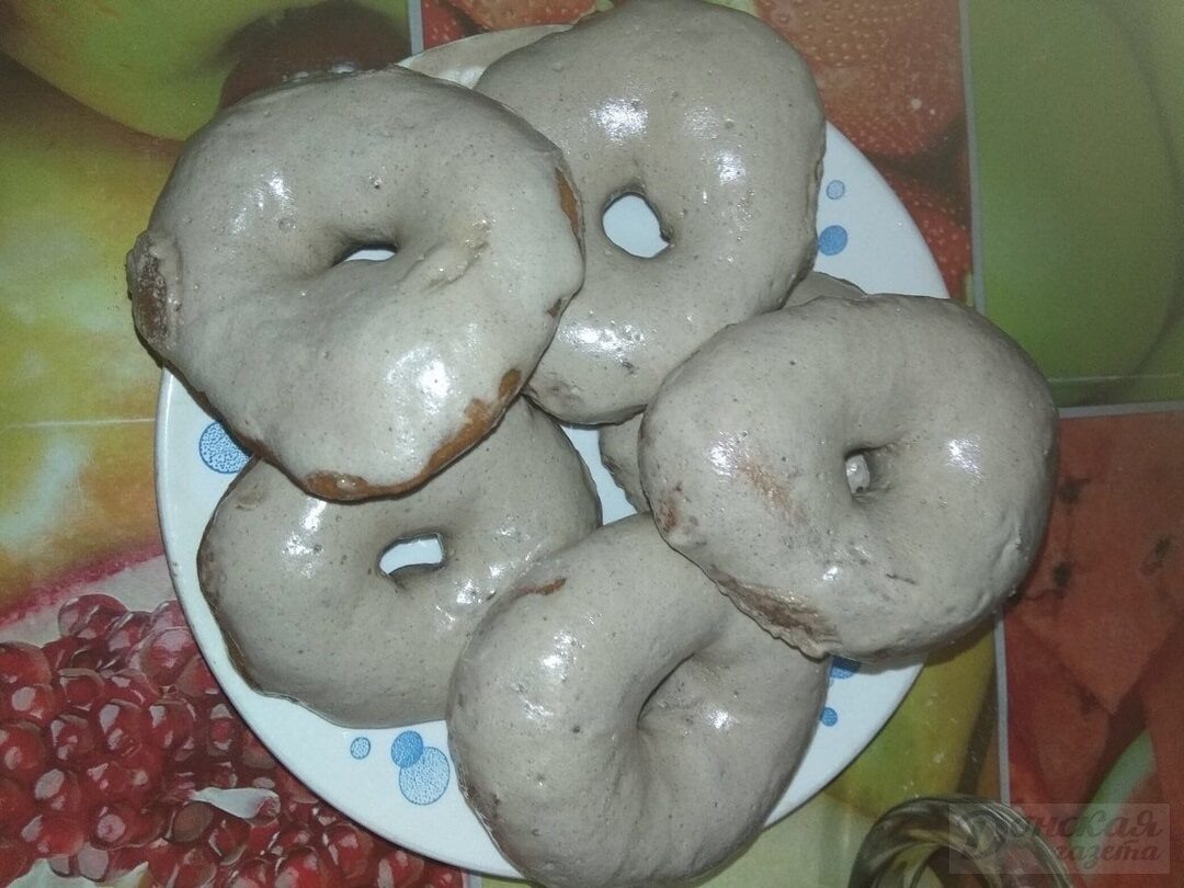 Вашему вниманию пончики в глазури от жительницы Северо-Задонска Эльвиры Ахмеджановой. Вам понадобится: 250 мл молока, 1 яйцо, 1 стакан сахара, 0,5 столовой ложки ванильного сахара, 2 чайные ложки соли, 2 чайные ложки сухих дрожжей, 0,5 кг муки. Приготовление: В тёплое молоко добавить 2 столовые ложки сахара, дрожжи и оставить на 15 минут, чтобы дрожжи «заработали». Все ингредиенты перемешать, хорошо вымесить тесто и оставить его подниматься на 1,5 часа. Сформировать пончики, дать постоять несколько минут и обжарить в масле с двух сторон. Для глазури 2 яичных белка 1 стакан сахара 1столовая ложка какао Взбить миксером белки, сахар и какао. Готовые пончики обмакнуть в глазурь. Приятного аппетита!