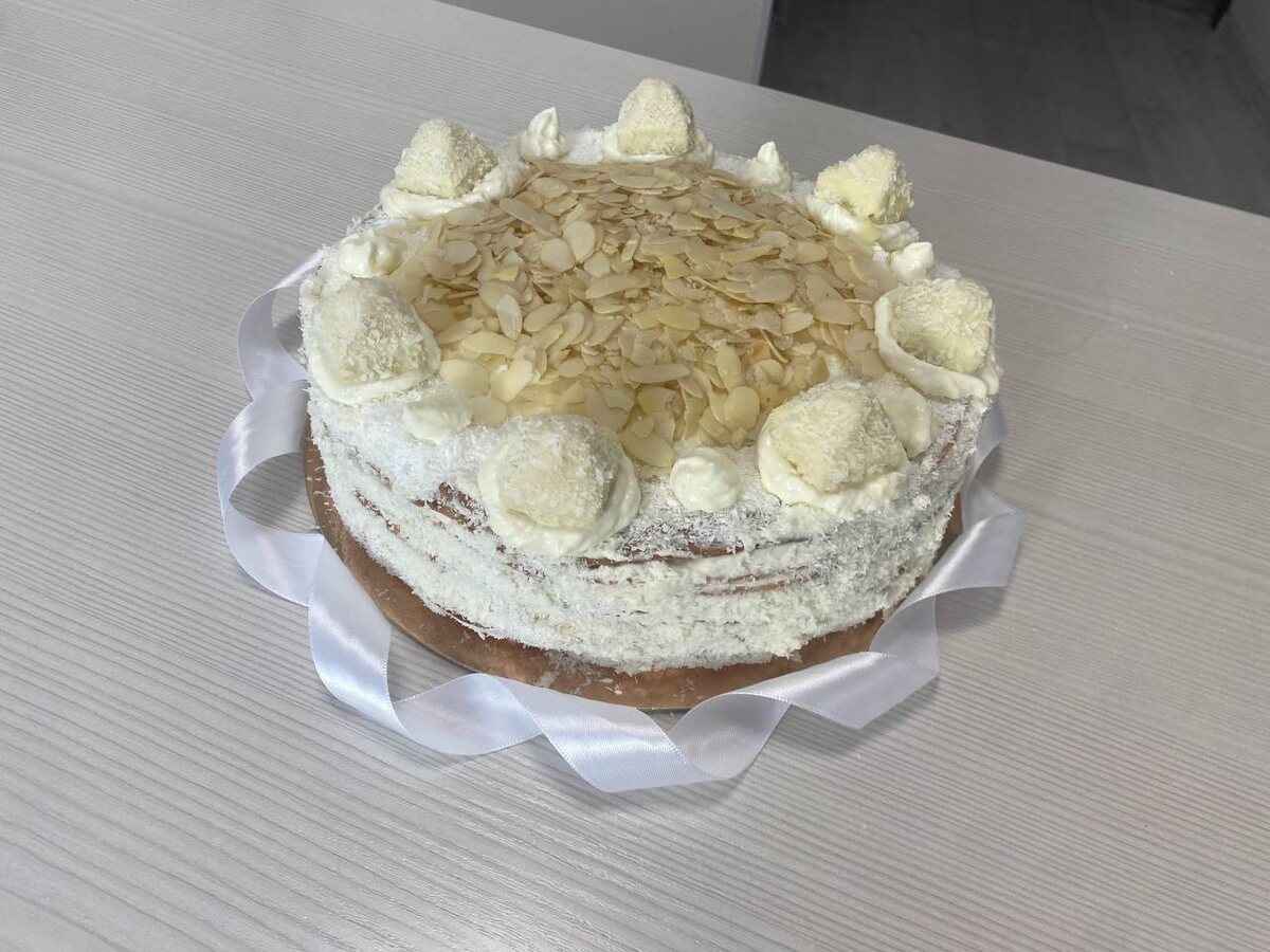 Доброго времени суток, мои дорогие читатели! Сегодня я хочу с вами поделиться простым рецептом вкусного и нежного торта. Особенно этот рецепт подойдет для любителей кокоса и всех кокосовых конфет. Содержание: Ингредиенты Ингредиенты для приготовления: Для теста нам потребуется: 1. Мука 330 г 2. Сахар 180 г 3. Яйца 3 шт 4. Разрыхлитель теста 1,5 ч.л. 5. Сливочное масло 45 г 6. Соль 0,5 ч.л. Для крема понадобится: 1. Сливки 33% 500 мл 2. Сливочный сыр 400 г 3. Сметана 300 г 4. Шоколад белый 160 г 5. Кокосовая стружка 60 г Для украшения потребуется: 1. Кокосовая стружка 90 г 2. Миндальные лепестки 50 г 3. Конфеты с кокосовой стружкой ~6-7 шт ( У меня конфеты Milla Vanilla, можно взять Rafaello) 4. Крем ~20-30 г Приготовим тесто! 1. В миске взбиваю яйца с сахаром и добавляю соль. Взбиваю миксером до светлой пены. 2. Далее к взбитым яйцам просеиваю муку с разрыхлителем. ( Муку лучше брать высшего сорта) 3. Перемешиваю тесто прямо в миске. Тесто может липнуть к рукам, это допустимо. В
