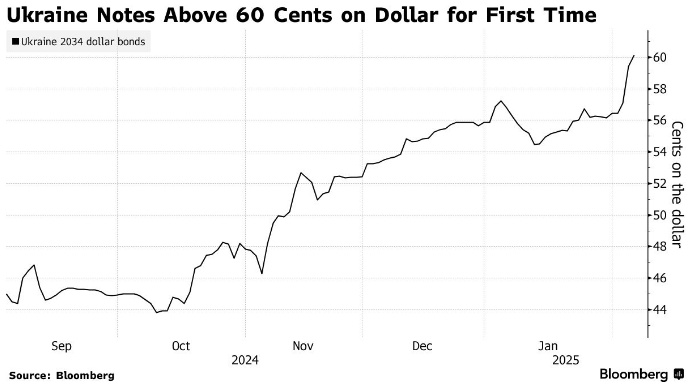 В среду администрация США пообещала представить мирный план по Украине в скором времени. Украинские облигации были среди лучших в четверг. Долларовые облигации страны принесли почти 8% прибыли в этом году Долг страны увеличился по всем срокам погашения, а облигации с погашением в 2034 году, достигли стоимости 60 центов за доллар — это самый высокий показатель с момента их выпуска в прошлом году. Согласно данным Bloomberg, доходность долларовых облигаций Украины в этом году составила 7,8%, что позволило им регулярно входить в число наиболее прибыльных ценных бумаг на развивающихся рынках. Ожидается, что на следующей неделе на конференции в Германии администрация президента США Дональда Трампа представит план по урегулированию конфликта между Россией и Украиной, как сообщило агентство Bloomberg в среду. Этот план, который будет представлен специальным представителем Трампа Китом Келлоггом, может включать в себя замораживание конфликта, предоставление гарантий безопасности Украине и прове