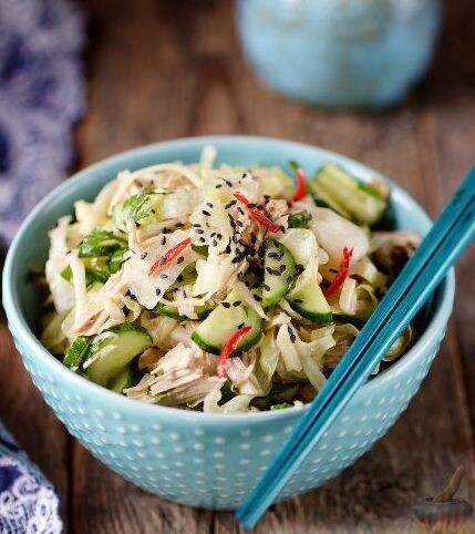 Добавьте нарезанные огурцы. Жгучий перец очистите от семечек, нарежьте тонкими полосками, добавьте к овощам. Готовое куриное филе разделите на волокна. Добавьте куриное филе в салат из огурцов, чуть посолите и поперчите. Дальше нужн
