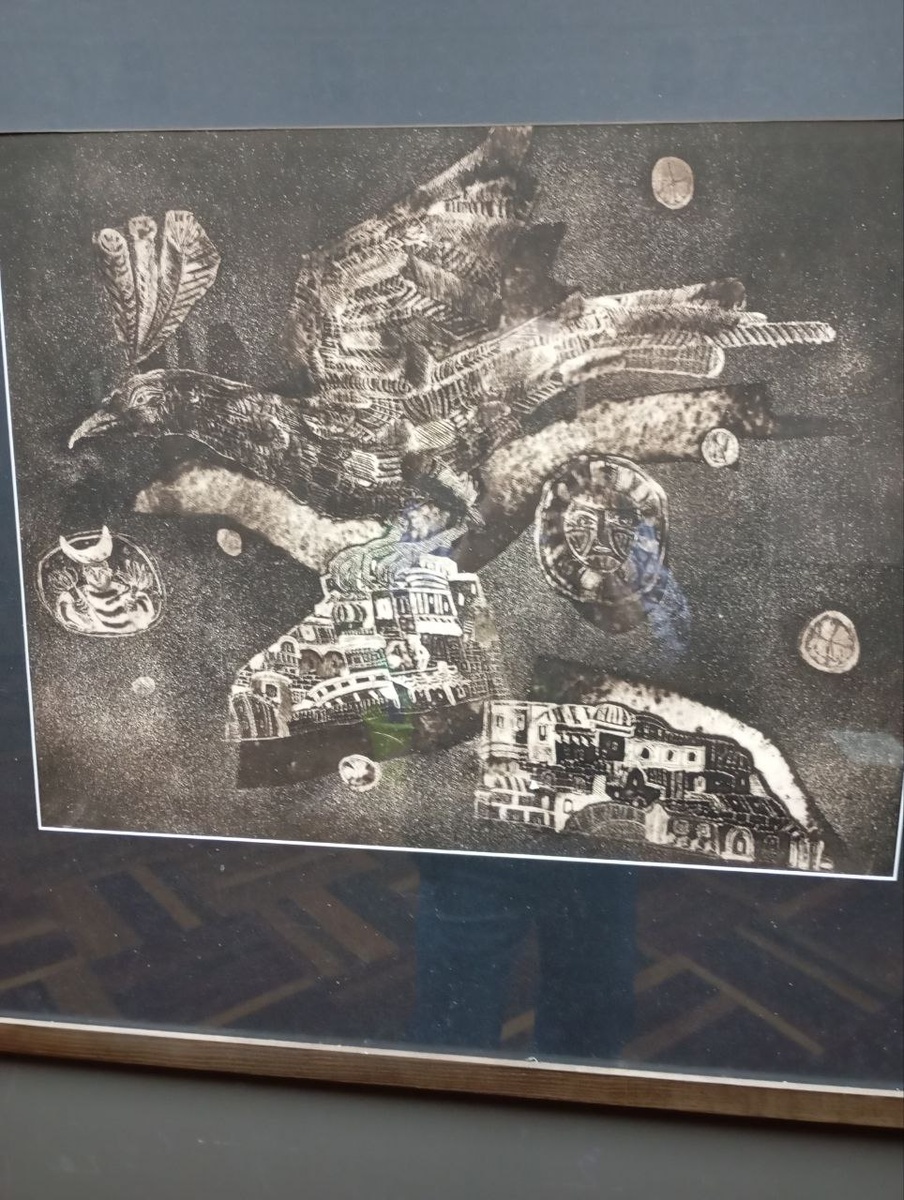 Птицы - их так много и они такие разные. Большие и маленькие, летающие высоко в небе, и сидящие на веточках - целый мир птиц, живёт рядом с человеком. Мы смотрим на них, изучаем, говорим о них, думаем - что-то, там. Птицы живут в преданиях, сказках, мифах, человеческих фантазиях. Они дают большую пищу для размышлений художникам. Вот и Гигошвили увидела свою птицу. Образ получился яркий, выразительный, приглашающий зрителя, возможно, к философскому размышлению о том, что - окружает нас в нашем мире, чем богат он и разнообразен, как воспринимаем мы всё то, что видим, как действует это на нас. Её птица в полёте. Она большая и, как бы окормляет, тот человеческий мир, который известен ей и присутствует рядом. Возможно, она прилетела из сказки, из полёта художественной фантазии автора - и это, не так уж важно. Важно то, что, образ великолепно исполнен в той технике, (бумага, цветной офорт) которую выбрала автор и говорит о большом мастерстве.