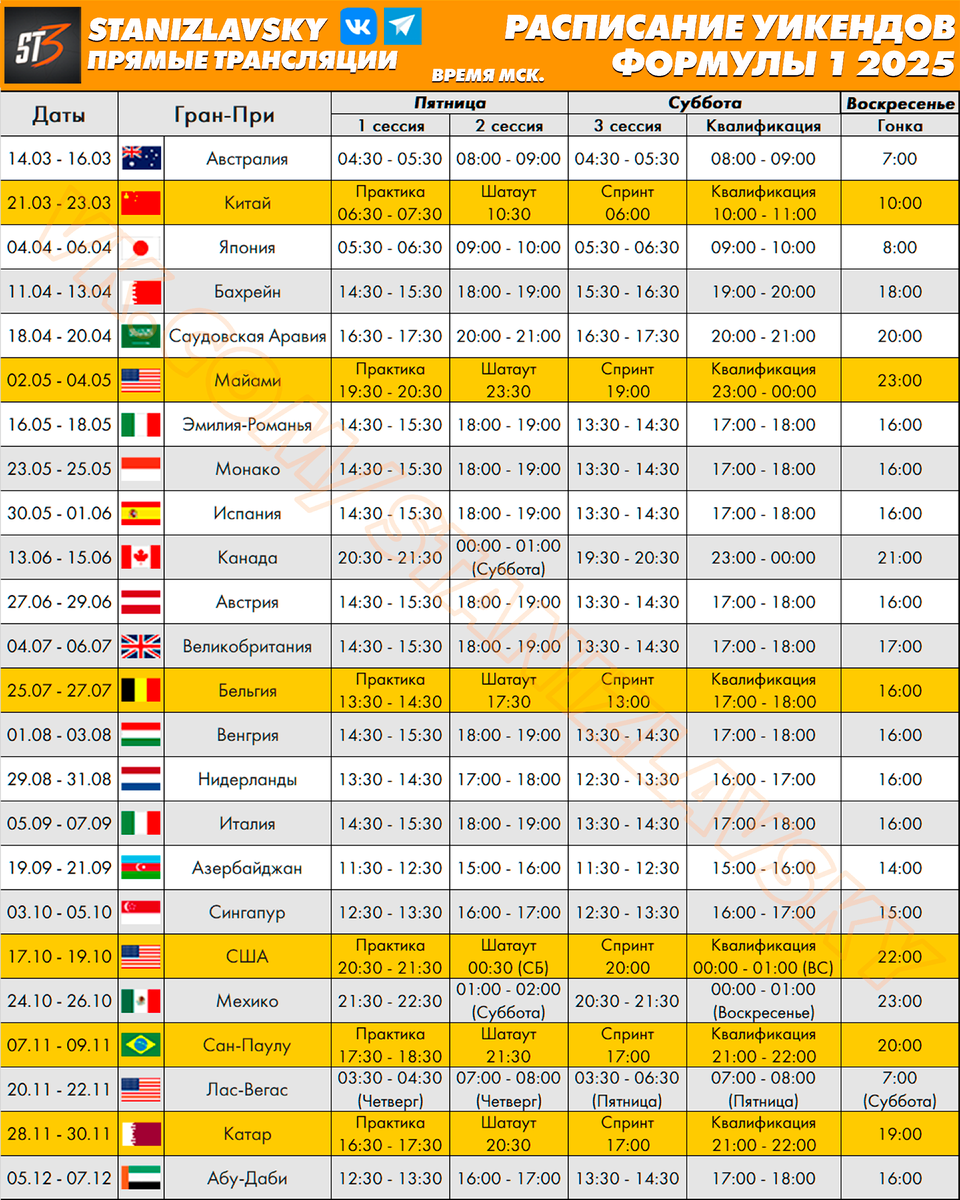 Календарь Гран-При Формулы 1 с расписанием каждого заезда на сезон 2025!