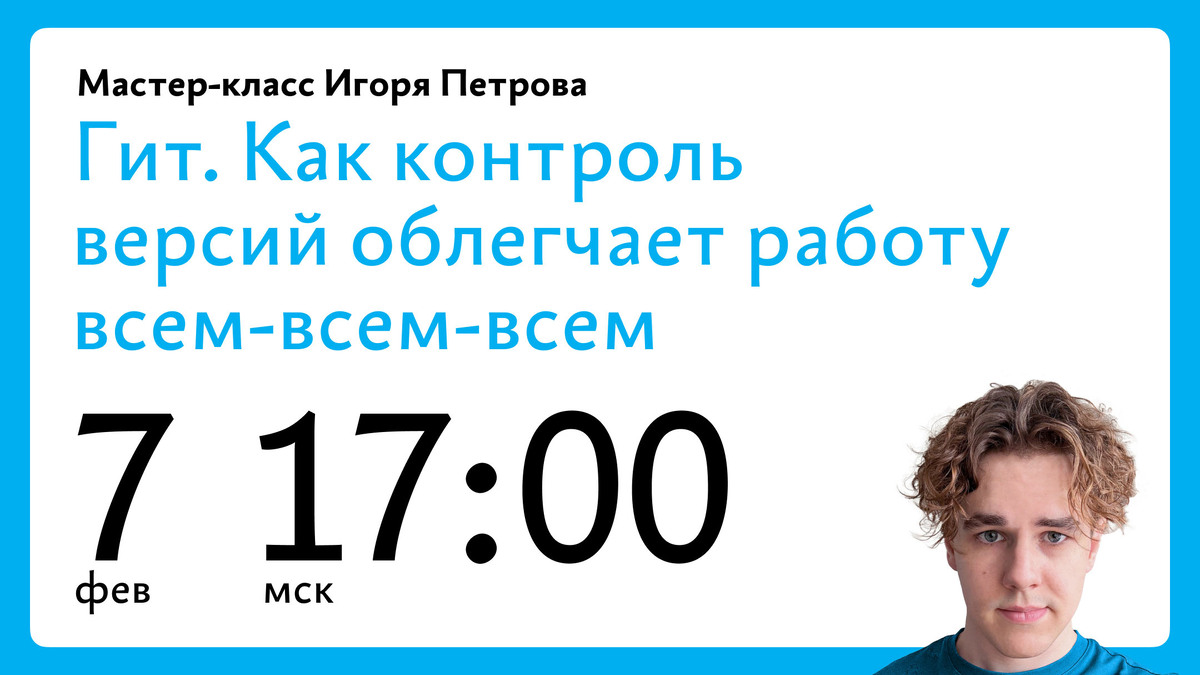 Хотим напомнить, что в пятницу 7 февраля в 17:00 мск Игорь Петров проведёт бесплатный мастер‑класс о Гите — незаменимом инструменте современного разработчика. Игорь — разработчик, автор советов по управлению разработкой и преподаватель в Школе бюро. Игорь объяснит пользу и покажет основные сценарии работы с Гитом. Участники мастер‑класса научатся устанавливать Гит в проект, узнают о базовых понятиях и функциях, работе с Гитхабом. В конце мастер‑класса — материалы для дальнейшего изучения тонкостей Гита. Мастер‑класс будет полезен всем. Даже если Гит напрямую не подходит для вашей работы, знать его концепцию полезно для расширения кругозора. А ещё — чтобы не краснеть от внезапного предложения коллеги «черипикнуть комитик прямо в мастер», и уметь давать на этот непростой вопрос твёрдый и чёткий ответ. Записаться на мастер‑класс