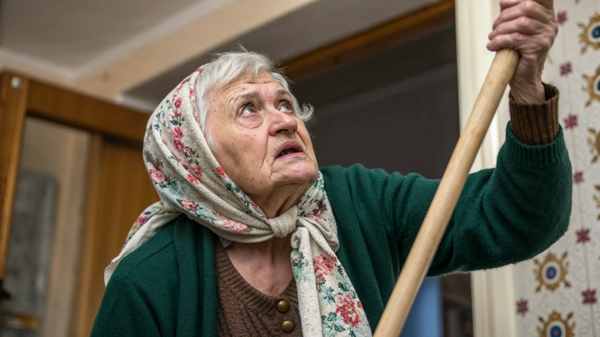 Баба Галя только того и ждала. Схватив швабру, она принялась остервенело колотить ей по потолку: