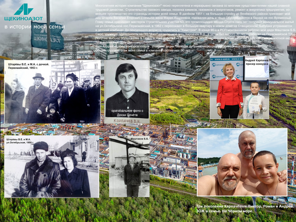 Завершаем серию публикаций о творчестве участников корпоративного конкурса «Щекиноазот» в истории моей семьи». Роман Карпачев, оператор дистанционного пульта управления 6 разряда производства АК/АС «Щекиноазота», выполнил свою конкурсную работу в технике фотоколлажа. …На предприятии трудились три поколения его семьи. На строительстве тогда еще газового завода работали бабушка и дедушка Романа. Это были первые годы жизни завода, трудные, героические, полные преодолений и побед. В ремонтно-строительном производстве вносил свою лепту в успех «Азота» его дядя – Борис Маштаков. Долгие годы проработал на предприятии отец Романа Карпачева – Виктор Николаевич, уважаемый человек, профессионал. Надеемся, что и Андрей, сын Романа Викторовича, свяжет свою судьбу с «Азотом», предприятием, в развитие которого вложили немало сил и энергии его близкие родственники. Еще раз благодарим сотрудников за участие в проекте и замечательные творческие работы, сделанные с душой, пронизанные любовь
