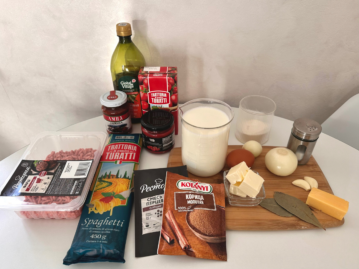 Мясной соус: Соус бешамель: На оливковом масле обжариваем говяжий фарш до тех пор, пока не выпарится вся жидкость. Добавляем лук, чеснок. Далее вливаем протёртые томаты, одну столовую ложку томатной пасты. Можно добавить аджику для остроты. Вливаем говяжий бульон или воду и добавляем соль, сахар, смесь перцев, корицу и лавровый лист. Накрываем крышкой и оставляем тушиться 1 час на слабом огне. Пока мясная начинка готовится, отвариваем спагетти и готовим соус. Растапливаем сливочное масло, добавляем муку, обжариваем. Вливаем порционно тёплое молоко. Варим до загущения, затем добавляем соль, пармезан, желток. Выкладываем в тарелку для запекания отварные спагетти, добавляем фарш, смазываем соусом бешамель. Сверху можно добавить ещё немного тёртого пармезана по желанию. Выпекать 40-50 минут при 180 градусах. Видео приготовления лазаньи по ссылке: Лазанья получилась очень сочная и вкусная. Приятного аппетита!