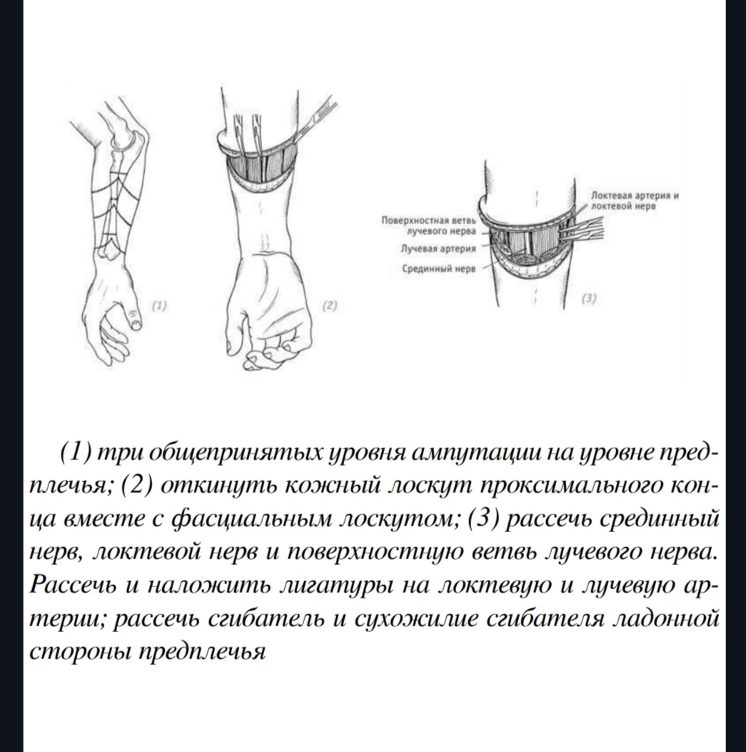 Существует три общепринятых уровня ампутации ❗❗Для сохранения ротационной функции предплечья важно сохранить длину конечности❗❗ Ход операции: 🪨 Создание дугообразных доступов равной длины на передней и задней сторонах. 🪨 Рассечение срединного нерва, локтевого нерва и поверхностной ветви лучевого нерва. 🪨 Выделение и рассечение локтевой артерии, лучевой артерии и сопутствующих вен. 🪨 Рассечение сгибателей и сухожилий сгибателей ладонной стороны предплечья. 🪨 Откидывание кожного лоскута проксимального конца и рассечение мышц и сухожилий тыльной стороны. 🪨 Отсечение лучевой и локтевой костей. 🪨 Выполнение гемостаза, сшивание мышечных брюшек или сухожилий сгибателя и разгибателя предплечья. 🪨 Послойное закрытие доступа, дренирование и наложение повязок. 🪨 Установка миоэлектрического или декоративного протеза после ампутации. Историческая справка Первую ампутацию предплечья провёл доисторический хирург около 31 000 лет назад на острове Борнео.