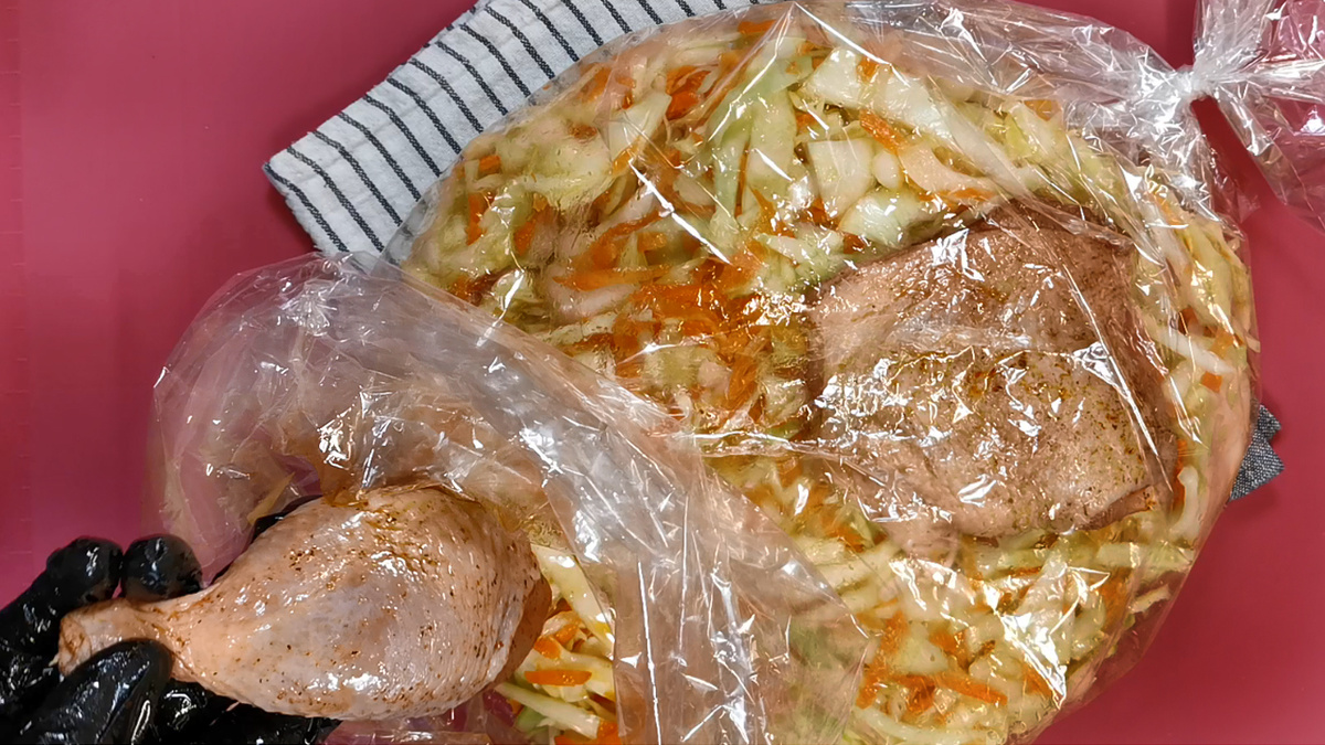 Закладываем в получившийся мешочек сначала капусту. А на неё сверху курицу. Завязываем рукав со второй стороны. Делаем в верхней части рукава несколько проколов, чтобы при раздувании наш рукав не лопнул.