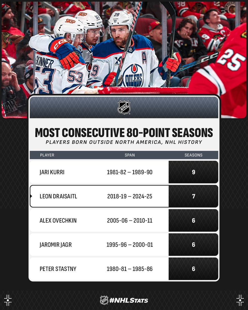 Германия — совсем нехоккейная страна, но время от времени точечно выдает в большой хоккей крутых игроков. Леон Драйзайтль — ярчайший представитель своей страны на хоккейном олимпе. Прошедшей ночью форвард «Ойлерс» набрал два очка в матче против «Чикаго» и в седьмом сезоне подряд преодолел отметку в 80 очков. Чтобы вы понимали, почему это так круто, замечу следующее: есть только один игрок в истории НХЛ, рожденный за пределами Северной Америки, который в своей карьере имеет больше таких сезонов. И это Яри Курри, финский нападающий. Он в девяти сезонах подряд добирался до отметки в 80 и более очков за сезон. У Овечкина, Ягра и Петера Штястны таких сезонов по шесть. Так что Драйзайтль по этому показателю уже круче большинства именитых европейцев. Леон Драйзайтль — уникальный хоккеист, на которого хотелось бы посмотреть вне «Ойлерс», ну или хотя бы «вне МакДэвида», скажем так. Пока они играют в одной команде, их сравнение идет непрерывно. Разговоры о том, что «Леон без МакДи ничего не стои