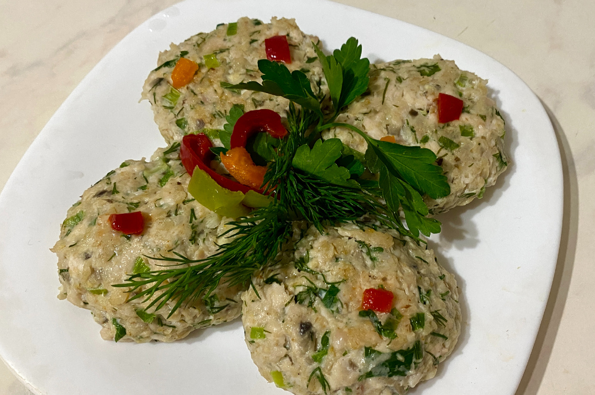 Сегодня в рубрике "Полезные рецепты" предлагаем вам простой рецепт диетических котлет с шампиньонами. Готовятся быстро, получаются вкусно! Вам понадобится (на 8-10 котлет в зависимости от величины): фарш - 500 гр. овсяные хлопья - 150 гр. шампиньоны - 6-7 шт. чеснок - 2 зубчика зелень - укроп, петрушка, зеленый лук соль и специи по вкусу можно также добавить перец и морковь, если хотите добавить вкуса Овсяные хлопья заливаем небольшим количеством (70 гр.) воды чтобы слегка смягчить. Перемешиваем и даем постоять 1-2 минуты, чтобы впитать влагу. Должна получиться консистенция каши. Полученную массу добавляем в фарш. Туда же мелконарезанные шампиньоны, зелень и чеснок. Добавляем любимые специи и соль Всё тщательно перемешиваем и тушим на сковородке на среднем огне 15-20 минут. Или же отправляем в пароварку на 20 минут. Украсим зеленью и перчиком. Вот и всё - блюдо готово! Приятного аппетита!