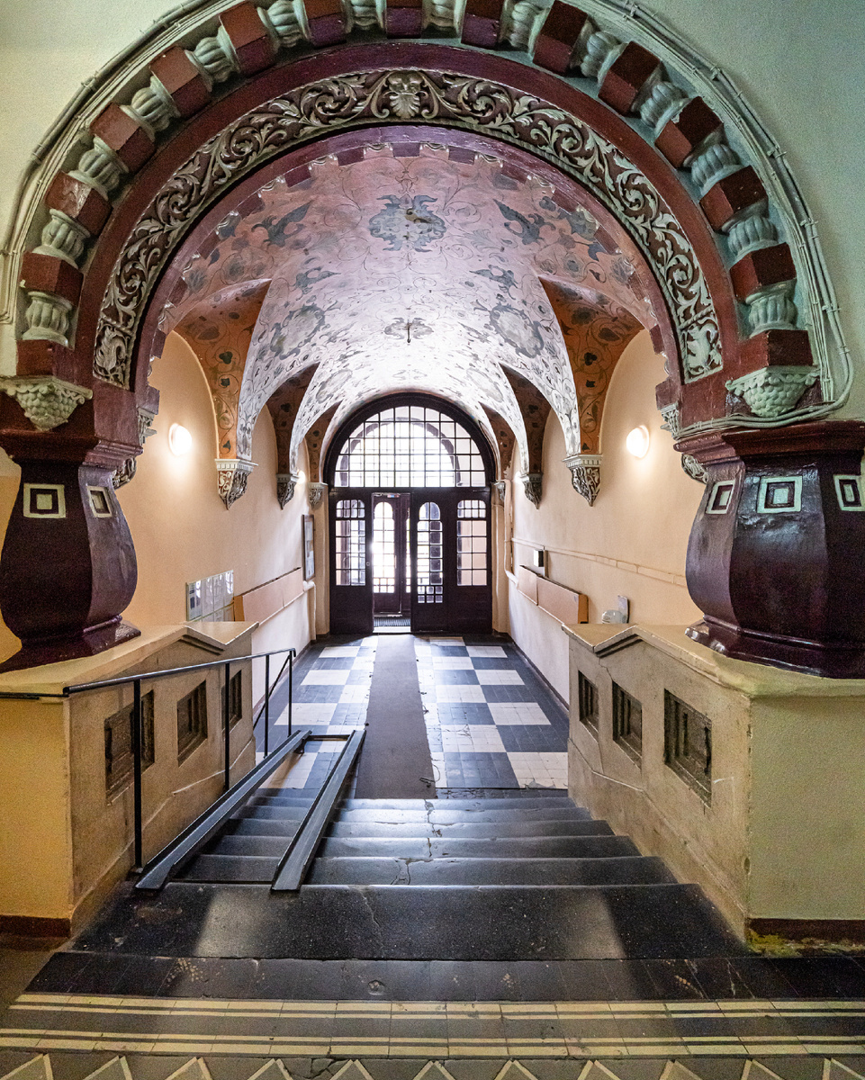 Перед вами парадный вестибюль в русском стиле, росписи которого напоминают мне росписи Собора Василия Блаженного. Обожаю этот доходный дом, построенный по проекту архитектора Ивана Кондратенко в 1912 году. К этому времени он ослеп от полученной на стройке травмы, поэтому без помощников обходиться не мог. Кондратенко работал над домом с коллегой С.А. Дорошенко. Парадный вход доходного дома стилизован под перспективный портал русских церквей. На боковых ризалитах размещены балкончики как на палатах бояр Романовых на Варварке. Под самой крышей центральной части дома расположены полукруглые отверстия, напоминающие бойницы крепостных стен. Фасад оформлен двумя четырехэтажными эркерами, завершающимися декоративными машикулями, то есть навесными бойницами, что обычно располагались в верхней части крепостных стен. Над эркерами на крыше устроены шатры, придающие им еще больше сходства с крепостными башнями. Сводчатые потолки парадного вестибюля украшены росписью, пузатые колонны поддерживают
