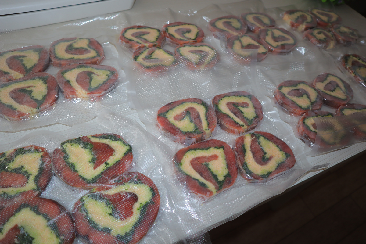 Затем рулет достаем из морозилки и нарезаем кружками толщиной примерно 1 см. Раскладываем медальоны в один слой на доске, которую застилаем предварительно пакетом. Доску с медальонами убираем в морозилку на 2-3 часа, чтобы они затвердели.