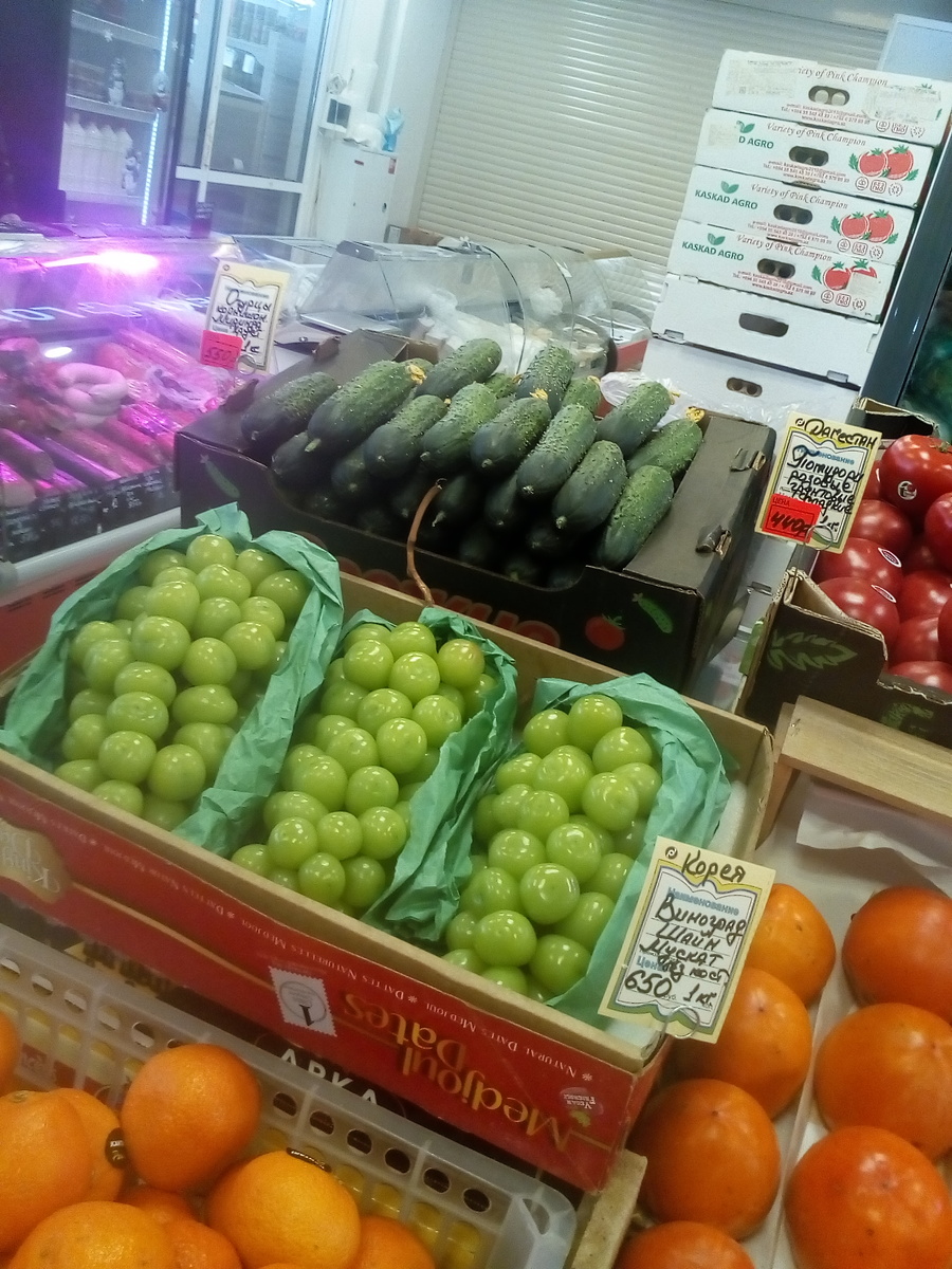Пофоткал... Смотрите, нам скрывать нечего! (доллар примерно 100 рублей) Если что - виноград слева... Зелёный. Зеленые - это не помидоры!!! Хотя по цене не сильно отличаются, да. Потом присмотрелся... Хурма же виноградом быть не может, верно? Значит - одно из двух... Это меня так шокировало - аж фотик достал... :0))) Быстрого приготовления. Почему в три раза дороже??? Купил... Я знаю, что я - жадный. :0((( Ну, надо же себе потакать? :0( Но я - кремень! Только две пачки... :0((( Поясню: 200 мл, - 115 р/литр... А тут: Литр такого же сока - 115 р. При этом хитрость видите? Яблочный по скидке - желтый ценик... А яблочно -виноградный, тоже по скидке - белый, типа нет скидки... :0)) "Врёшь, не возмёшь", - думает маркетолог... "А я возьму..." - думаю я. :0))) Так и живём