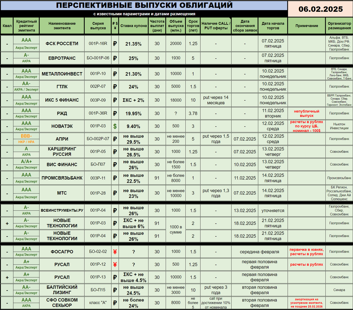✌️ Вечерний новостной итоговый пост прибыл, разгружаю в ваши ленты, если позволите :) ---------- 🆕 НОВЫЕ РАЗМЕЩЕНИЯ / АНОНСЫ: ❄️ СФО СОВКОМ СЕКЬЮР (🅰️🅰️🅰️) анонсирует новый хитрый выпуск, основу которого составляют потребительские кредиты. Если помните, подобные бумаги с приставкой "СФО" мы уже встречали от ВТБ $RU000A109NC4, СБЕРа $RU000A1097T6 и СПЛИТ ФИНАНС $RU000A10AAQ4. Особенность данной бумаги - call (досрочное погашение при достижении 10% от номинала) и амортизация на усмотрение эмитента, но начало ее случится не позднее 25.02.2026. Купонный период - месяц, за исключением первого. Он продлится с даты размещения до 25.04.2025. Когда будут собирать заявки, скажут позже, но где-то во второй половине февраля. Ставка купона - не выше 24%. Организатор, как вы уже наверняка догадались, Совкомбанк :) ❄️ НОВАТЭК (🅰️🅰️🅰️) довольно потирает руки - ведь по итогам сбора заявок купон снизили с 10 до 9,4%, объем вырос с 200 до 500 миллионов долларов. ОК :) ❄️ Подали заявления на