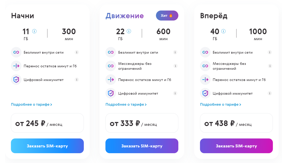 «Пробуй», «Действуй», «Побеждай» заменили на «Начни», «Движение», «Вперёд» С мест сообщают, что ГазПромБанк Мобайл запустил новую линейку тарифов (старые убрал в архив). Пишут, что стоимость тарифов снизилась, а пользоваться услугами банка теперь необязательно. В этом есть определенное лукавство: на главной странице сайта наполнение тарифов указано с бонусными гигабайтами (а они как раз начисляются при выполнении условий, в том числе по использованию банковских карт), а их стоимость указана при условии оплаты за год вперед. Если же убрать бонусные гигабайты и скидку за оплату на год или полгода вперед, тарифы выглядят уже не так привлекательно. Базовый тариф – «Начни», без скидок и бонусов он стоит 350 рублей в месяц, включает 5 гигабайт и безлимитные звонки на номера ГПБМ, если же выполнить условия (подключение к программе лояльности «Быть вместе», оплата покупок картой Газпромбанка от 15 000 ₽ в месяц, оплата тарифа сразу за 12 месяцев) пакет увеличивается до 11 гигабайт, а стоимость