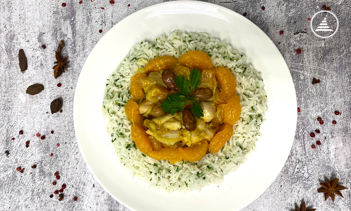 Выкладываем на тарелку рис, тушеную курицу. Украшаем жареным миндалем и консервированными мандаринами.